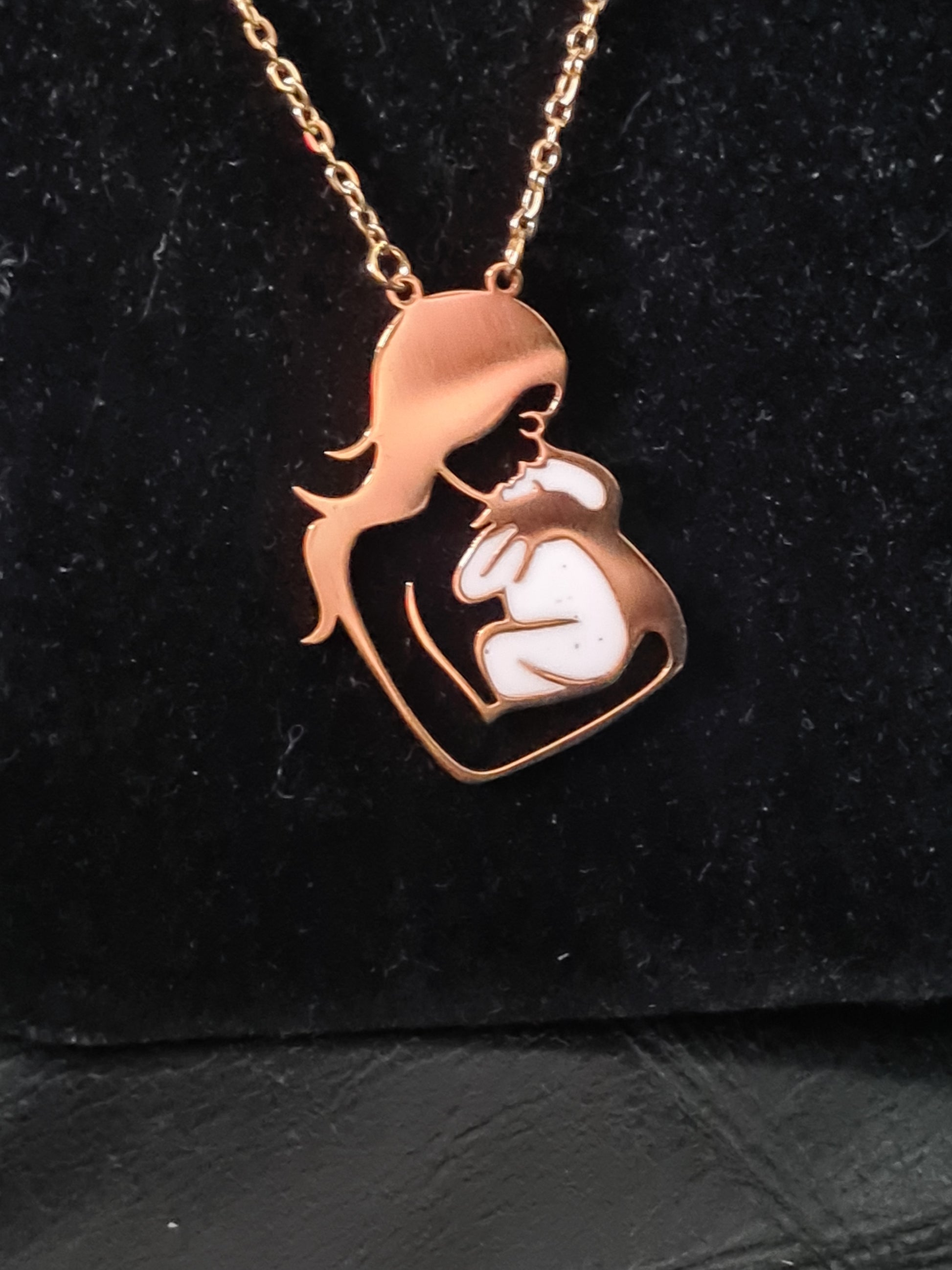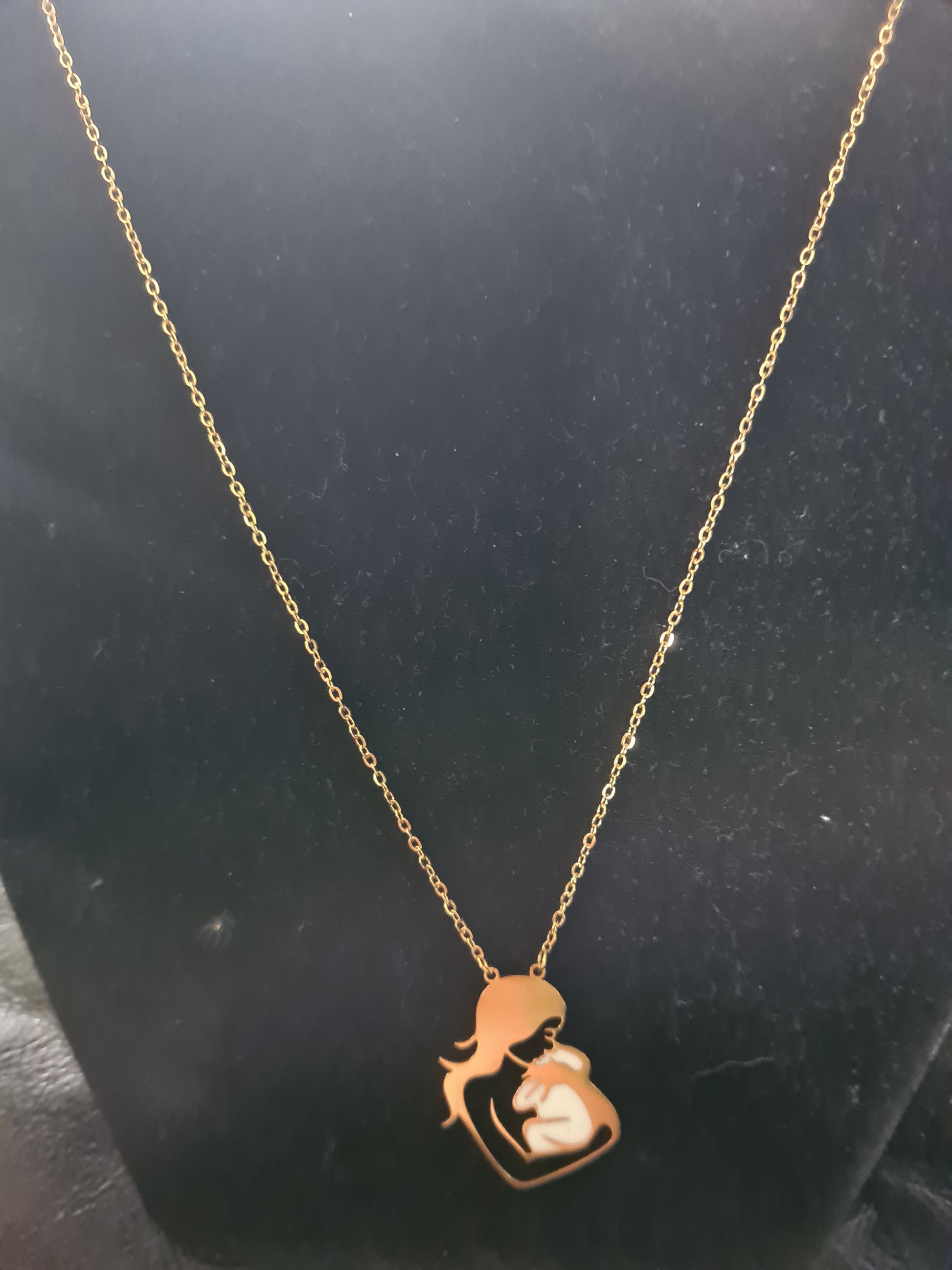 This stunning gold plated necklace features a delicate and intricate design of a mother holding her newborn child. Crafted with high-quality materials, it is a beautiful and meaningful accessory for any new or experienced mom to cherish. Celebrate the bond between mother and child with this elegant necklace.